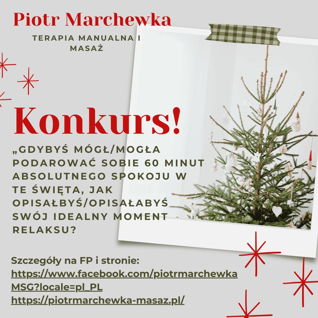 Weź udział w konkursie na Facebooku! Wystarczy, że odpowiesz w komentarzu na pytanie: „Gdybyś mógł/mogła podarować sobie 60 minut absolutnego spokoju w te święta, jak opisałbyś/opisałabyś swój idealny moment relaksu?” Trzech autorów poprawnych odpowiedzi nagrodzimy zabiegiem masażu relaksacyjnego 😀